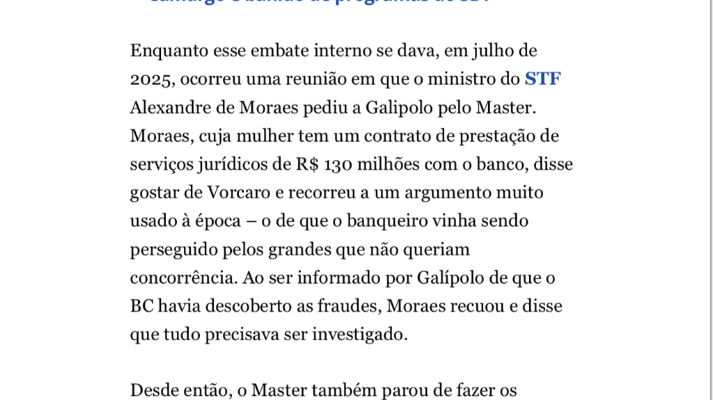 Reproduzo acima parte da coluna da jornalista Malu Gaspar de hoje, no O Globo. Observe que, depois de afirmar, alegando seis fontes, que o ministro do STF Alexandre Moraes fez “pressão” sobre o presidente do BC, Gabriel Galípolo, para aprovar a fusão do banco Master, de Vorcaro, com o BDB, agora muda para “pediu” não se sabe exatamente o quê ao presidente do BC, durante uma reunião em julho e, aparentemente, na frente de muita gente. Ou alguém entre esses andou falando demais, ou a jornalista ouviu demais.