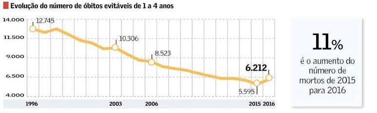 A divulgação do índice de 2016 de aumento de 11% nos óbitos de crianças com 1 a 4 anos, óbitos evitáveis, objeto exclusivo dessa pesquisa, nos coloca na situação de alerta total quanto ao tipo de país que estamos construindo e para quê.