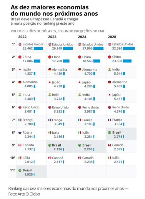 Pessoalmente, tenho reservas quanto aos critérios que formam e avaliam o tamanho do PIB dos países, começando pelo uso do Dólar como referência central. Como a moeda está sujeita a variações influenciadas pela política monetária do único país emissor, os EUA, como acontece atualmente, é sempre uma baliza cambaleante.