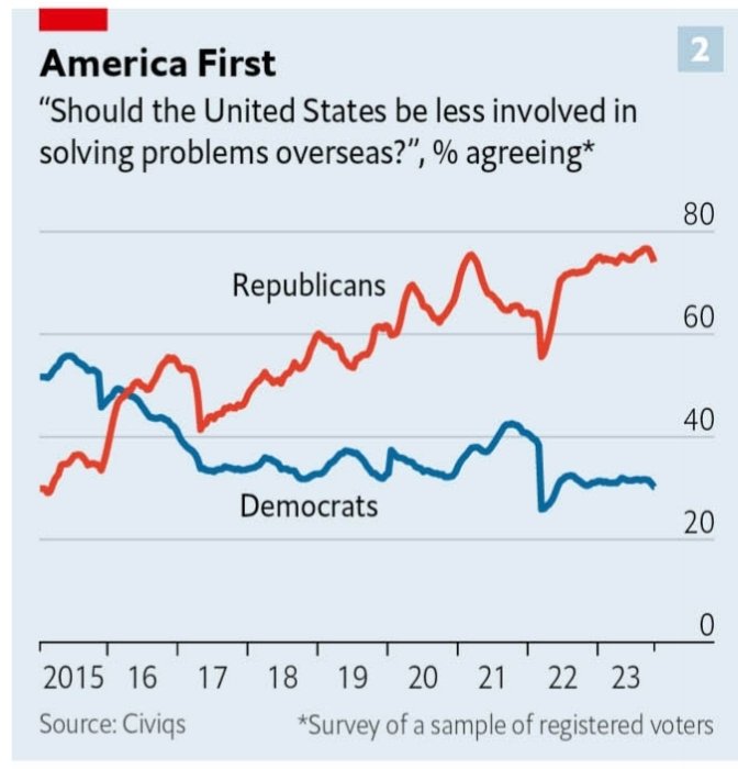 A vitória de Trump anterior foi baseada nisso, o gráfico mostra claramente como captou o desejo de seu partido no geral e nas franjas da oposição, cansados das guerras. Seu governo alucinado não permitiu uma reeleição, que agora fica mais provável com os repetidos e apocalípticos apoios de Biden a guerras e genocídios.