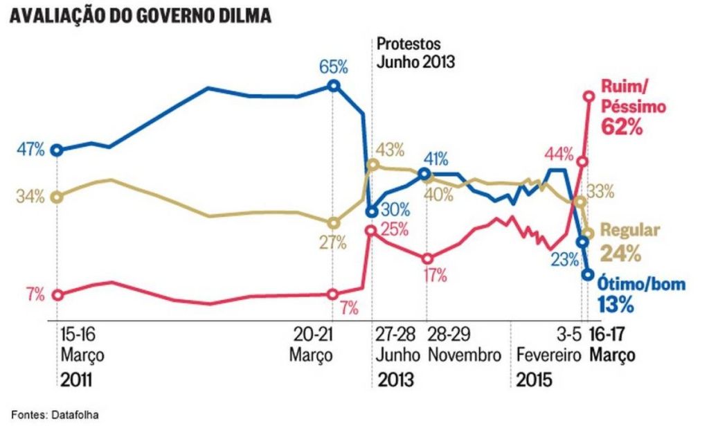 Para ilustrar o post, utilizei um gráfico com pesquisa de opinião do governo Dilma. As datas que mostram a queda de aprovação evidenciam a guerra cultural, midiática e política da qual fomos vítimas. Isso também ressalta por que fomos golpeados ali e como ainda não acabou. Além disso, deixa claro a fragilidade de nossa posição, que precisa ser sempre defendida com inteligência, disposição e coragem.