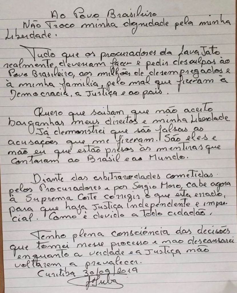 A carta de Lula recusando a barganha que a lava jato ofereceu ainda quando estava preso, para obter a prisão domiciliar, desde que reconhecesse os crimes falsos que lhe imputaram, ilustra e relembra a luta desse homem contra essa gente, a imprensa, o Departamento de Estado dos EUA e parte da população brasileira.
