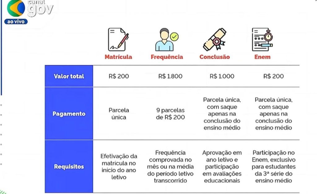 Como prometido, lançado o programa Pé de meia, uma poupança e pagamentos mensais, mediante cumprimento de alguns quesitos, na esperança de diminuir o preocupante número de evasão escolar no ensino médio . Desobrigando o jovem estudante de trabalho imediato e abandonar os estudos, além de juntar uma poupança que pode servir, ao final da conclusão integral do período previsto para o ensino médio , para iniciar algum negócio próprio.