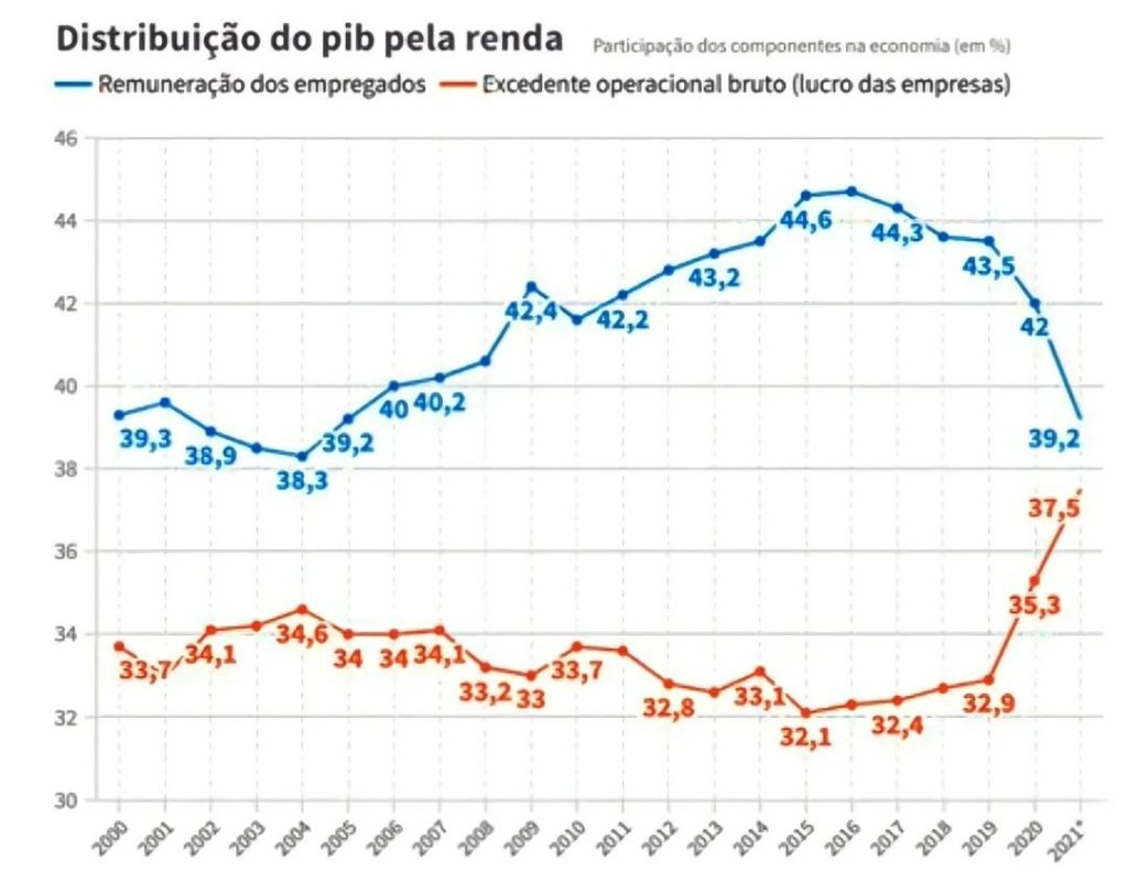 O gráfico que ilustra o post é talvez a prova mais contundente do golpe que derrubou Dilma; onde a motivação de parte do empresariado fica evidente. E não era econômico, como a linha praticamente reta da parcela do ganho empresarial mostra o equilíbrio ao longo de tantos anos. Já a linha de ganhos dos trabalhadores , seguia ascendente. O estudo deixa claro que o ganho de um não se deu a custa de perda de outro. E como a derrubada da presidenta Dilma mudou o quadro : dali em diante a perda referentes aos ganhos do trabalho passa a ser entregue aos patrões.