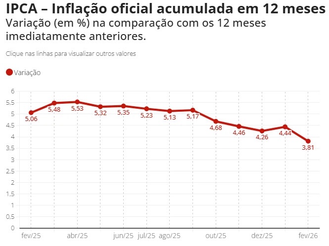 A inflação de fevereiro de 0,7% apontada pelo IPCA foi relativamente alta, mas, como concentrada no aumento das mensalidades escolares e inferior ao mesmo mês em 2025, segue declinante no acumulado anual, chegando a 3,81% .