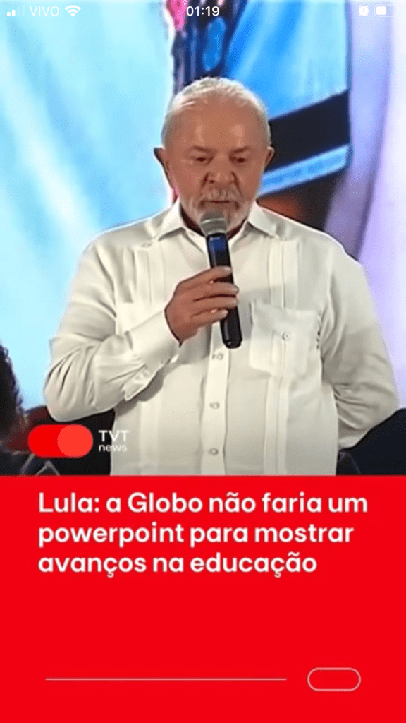 Tem creches, escolas, institutos federais, universidades e hospitais universitários chegando para fortalecer o ensino público, e aproveitando durante seu discurso para provocar o PIG em geral e a Grupo Globo em particular, perguntando se eles iriam fazer PowerPoint das entregas realizadas durante o seu governo.